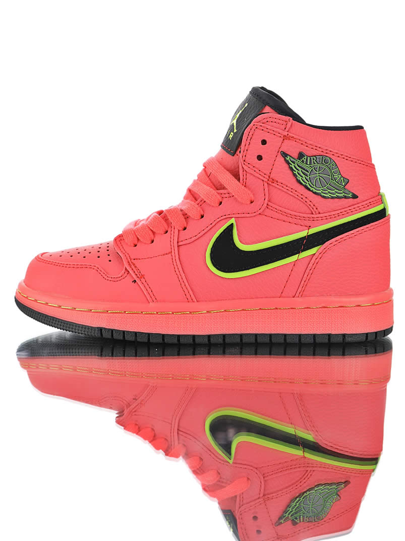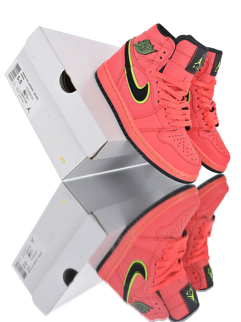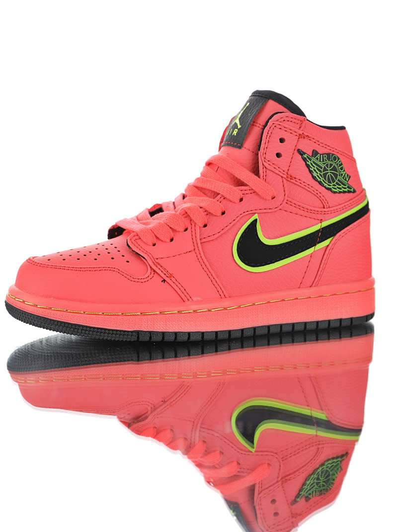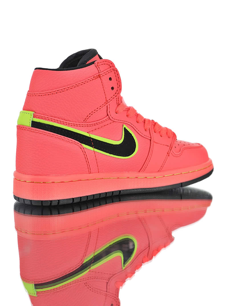 The color scheme of Air Jordan 1 Retro Premium "Hot Punch" Pink is still bright and eye-catching. This new Air Jordan 1 "Hot Punch" is dominated by pink, unique and eye-catching. The high quality lychee leather upper has an unforgettable texture. Black Swoosh and Flying Wing logo The edges are outlined in yellow, which brightens the overall tone and makes the shoes more youthful.